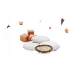 Un’anima di cioccolato bianco con pezzetti di caramello croccante avvolta da cioccolato al latte e ricoperta da un sottile strato di zucchero.